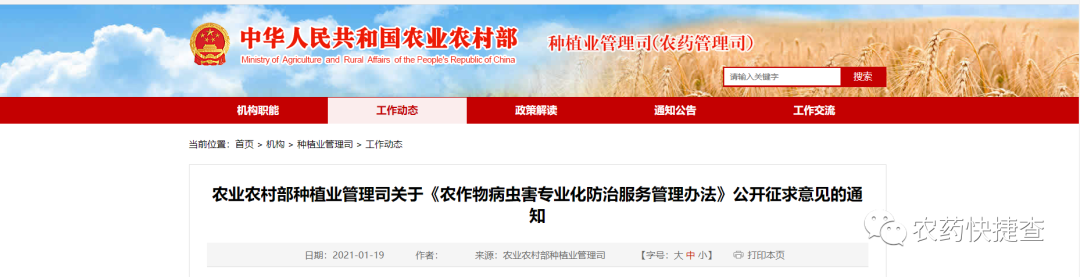 为贯彻落实《中华人民共和国生物安全法》《农作物病虫害防治条例》规定,进一步规范专业化防治服务工作,农业农村部种植业管理司会同全国农业技术推广服务中心组织起草了《农作物病虫害专业化防治服务管理办法(征求意见稿)》。现公开征求意见。公众可通过以下途径和方式提出反馈意见,意见反馈截止时间为2021年2月19日。